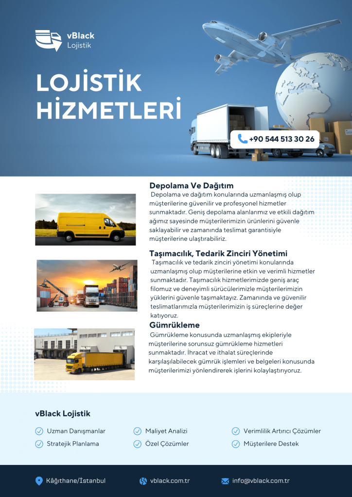 Lojistik kadromuz depolama, dağıtım, taşımacılık, tedarik zinciri yönetimi ve gümrükleme gibi konularda uzmanlaşmıştır. Bu sayede müşterilerimiz, tüm lojistik süreçlerini tek bir çatı altında yönetebilir ve operasyonel verimliliği artırabilir.
